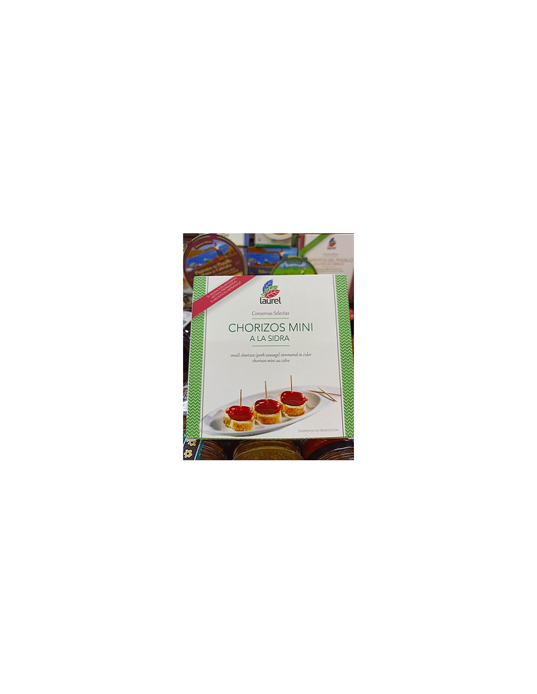 Plato preparado formado por 9-10 unidades de pequeños chorizos cocidos en sidra natural. El chorizo está fabricado con colorante natural, sin antioxidantes y sometido a un proceso de ahumado suave para evitar acidez del mismo.